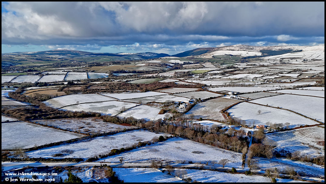Turning the camera to the west show how localised the snow in fact was, with green fields around the central valley, although South Barrule in the distance has a white cap.
