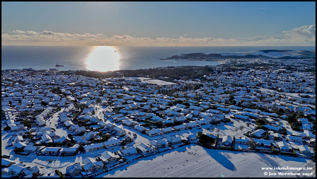 We're looking across the Birch Hill area of Onchan here, straight towards a low sun reflecting off the sea.