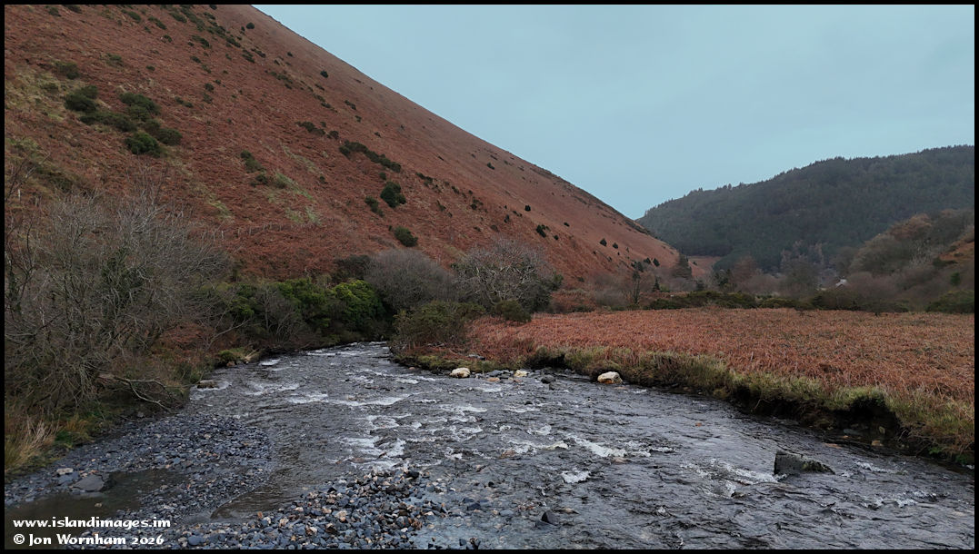 As mentioned, the weather wasn't ideal for my flight, with regular rain showers passing through, but here I'm in a low hover over the Sulby River ready to fly up the slope on the left.