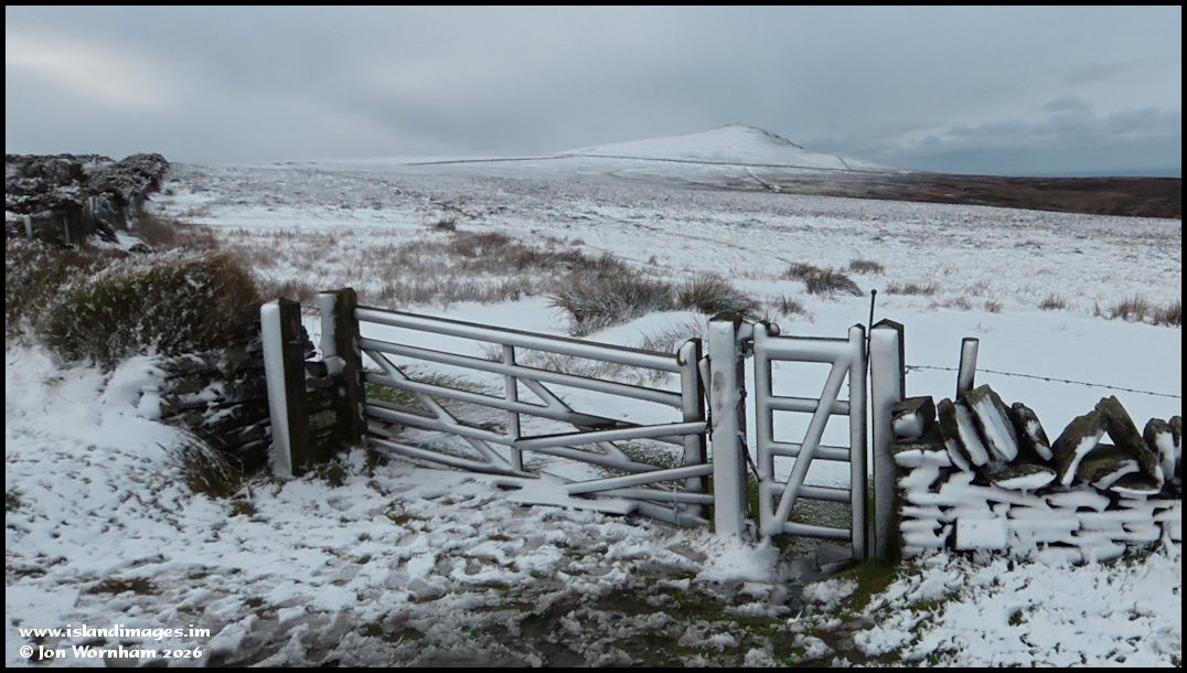 A snow encrusted gate at Round Table, with Cronk-Ny-Arrey-Laa in the distance over the snow covered moorland.