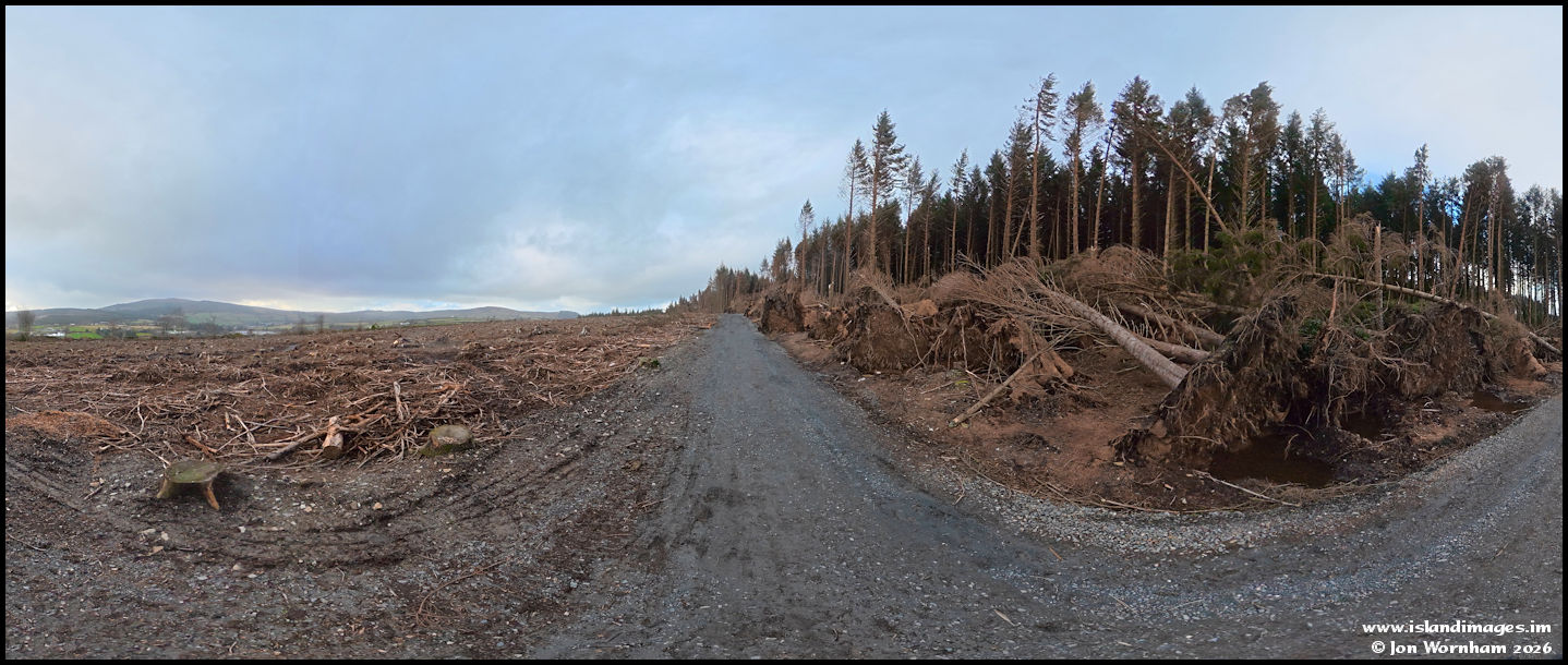 This is just a 'slice' from one of the panoramas that you can view later. What was once a forest track sheltered by the trees is now wide open to wind and weather. Storm damaged trees lie to the right of the track.