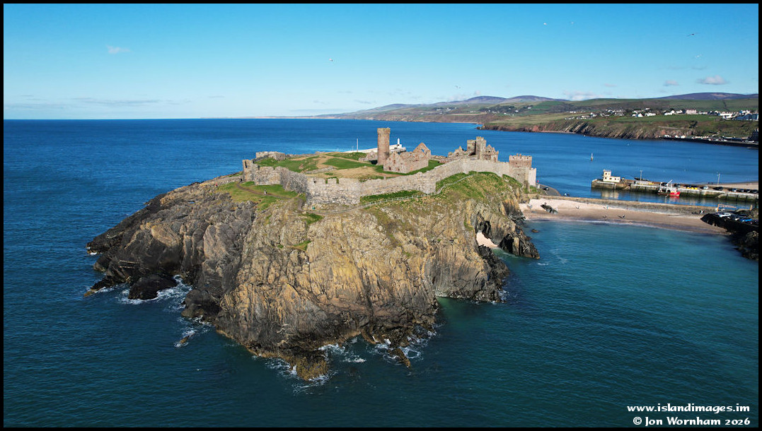 Dropping down over the sea to show the bulk of St Patrick's Isle. Before the causeway was constructed, it was a genuine island and the River Neb flowed out to sea where Fenella Beach is now.