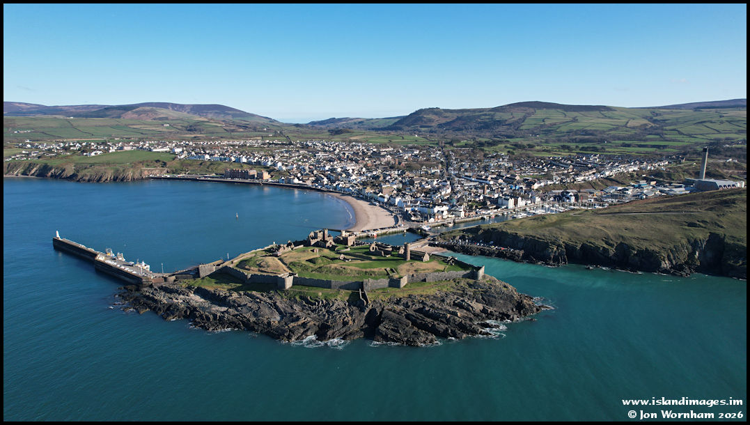 Flying further out to sea to try and include most of the town in shot. In the distance, you can just see the sea on the far side of the island, through the central valley.