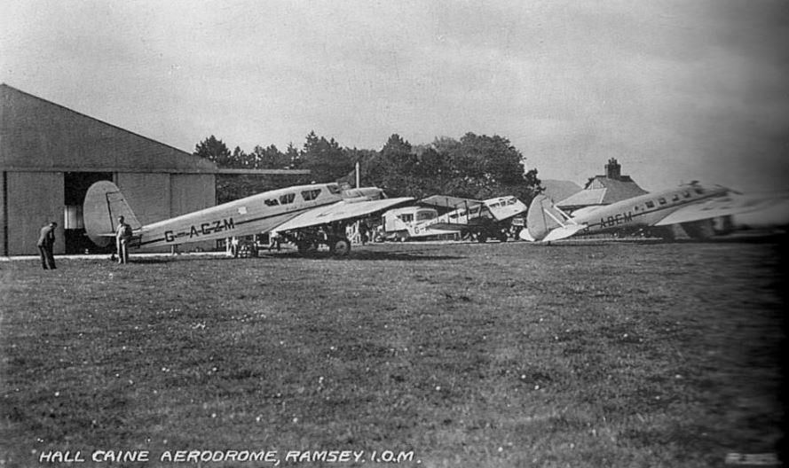 Hall Caine Airport with Northern & Scottish Airways Spartan Cruiser Mk II G-ACZM, Spartan Cruiser Mk III G-ADEM and an unidentified DH84 Dragon. G-ADEM dates the picture to 1936 as it was first registered in August and written off in December.