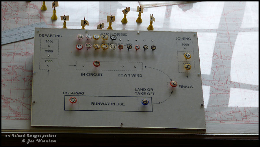 The Local Controller's pinboard, showing aircraft positions in the visual circuit. Landing and take-off clearance would normally be given by the Airfield Controller using light signals from the runway caravan