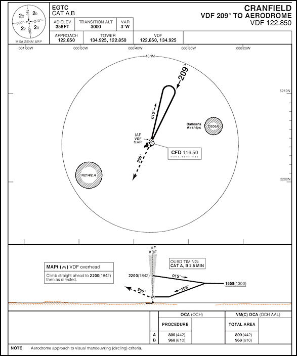 Chart for a present day pilot interpreted D/F Approach at Cranfield. Legs to be flown, timings and levels to be flown are shown on the chart. Published as 'Approach to Visual Manoeuvring' i.e. not to any particular runway.