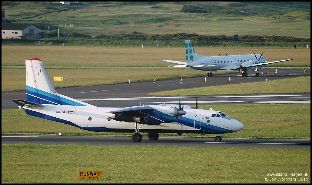 Budapest Air Service An26 HA-TCY rolls out on runway 26 after arriving with the mail at 06:15. Emerald ATP impounded behind.