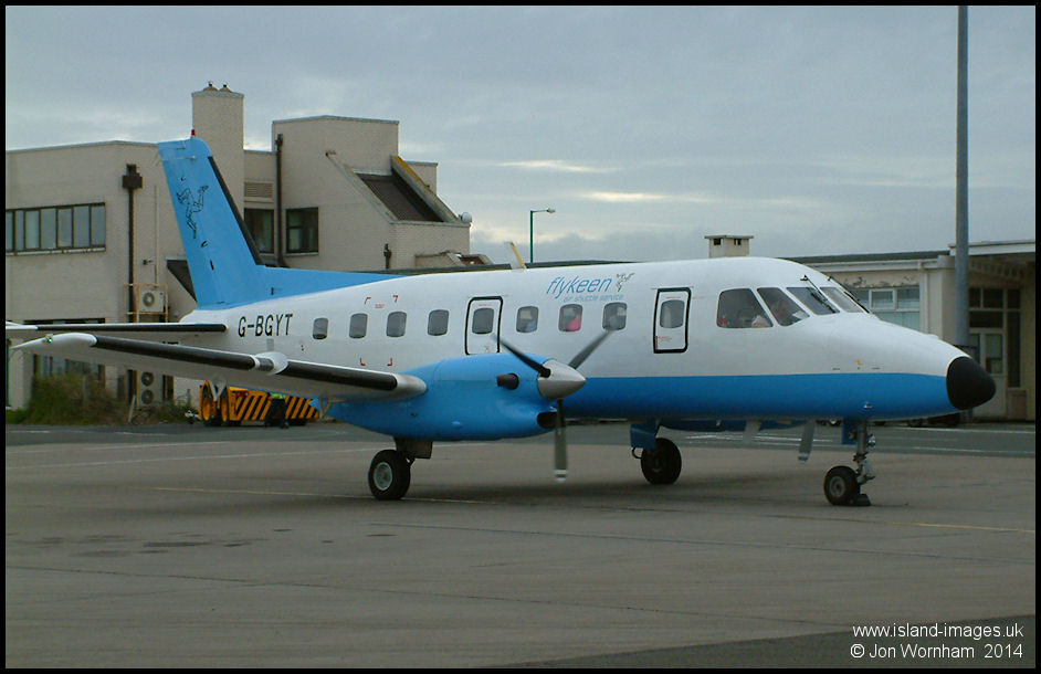 Keenair Bandeirante G-BGYT repainted into a new 'Flykeen' blue scheme with the Manx 3 legs on its tail