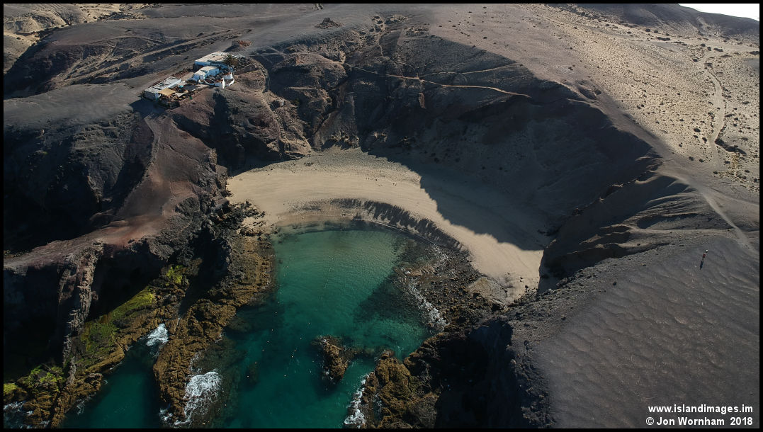 A near vertical view of the beach, with the shadow slowly retreating as the sun climbs higher.