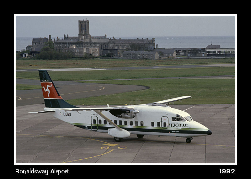 Manx Airlines Short 360, G-LEGS, taxies onto the west apron in a revies version of the colour scheme with 'Manx' title moved to the nose