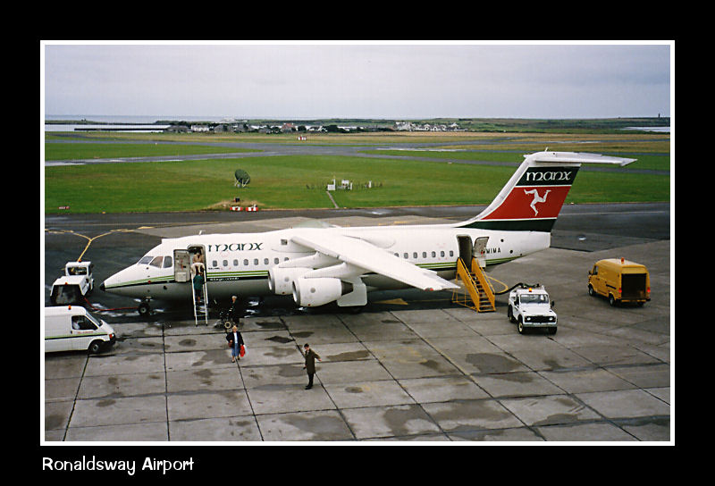 Manx Airlines BAe146-200, G-MIMA, has probably just arrived from London Heathrow