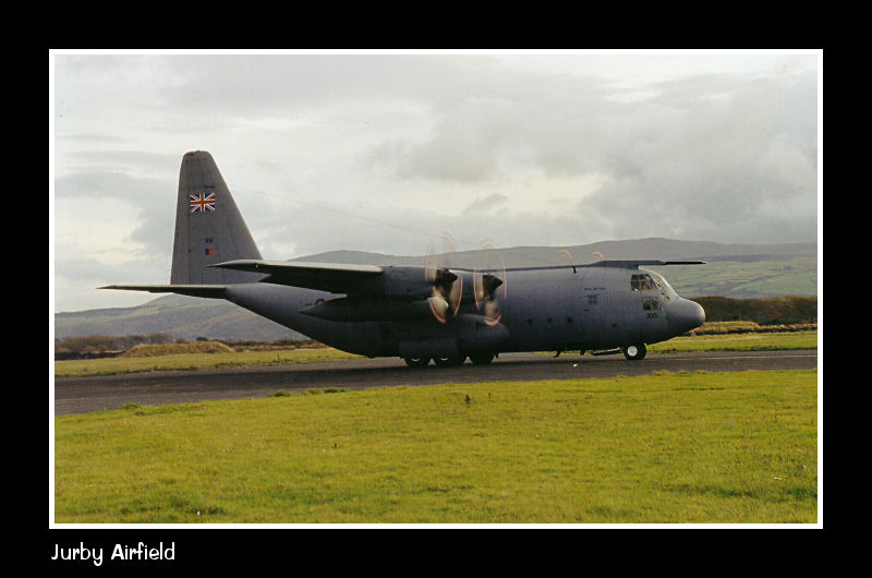 RAF C130 Hercules XV300 touches down at Jurby. The aircraft was due to return at 03:00 for a night landing using night vision goggles - Jurby had no airfield lights!