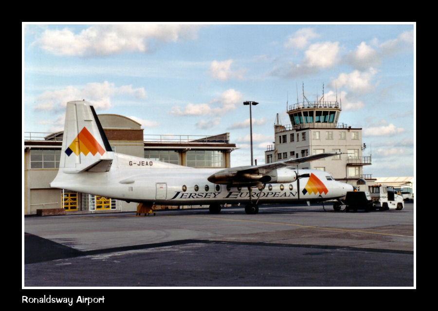Jersey European Fokker F27 G-JEAD on the west apron. Note that the radar scanner has now gone from the control tower