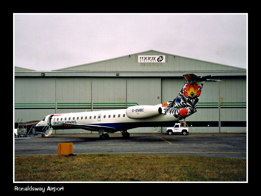 Third of the EMB 145s to be delivered was G-EMBC, pictured in front of the Manx Airlines engineering base in BA colours. Delivered October 1997 when the picture was probably taken