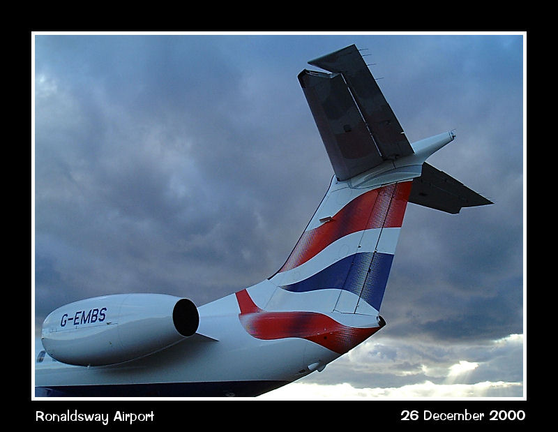 A close-up of the tail of EMB145 G-EMBS, in the BA 'Chatham' colour scheme