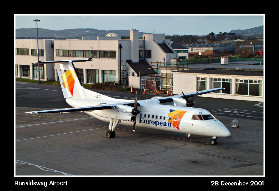 British European Dash8-Q300, G-JEDD, parked (badly - overhanging the roadway!) on stand 2