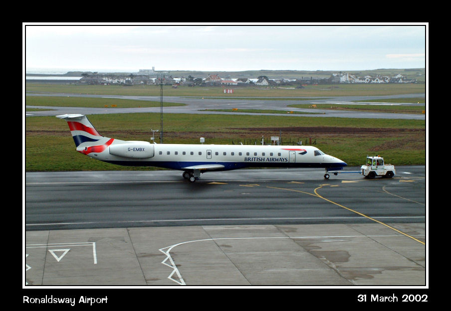 British Regional ERJ145, G-EMBX, is towed on the link taxiway in front of the control tower