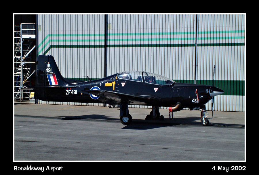 RAF Tucano ZF491 parked outside the Manx Airlines hangers