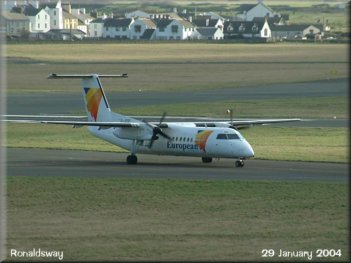 FlyBe British European's Dash8-Q300, GJEDC, taxies off the runway with the houses of Derbyhaven in the background.