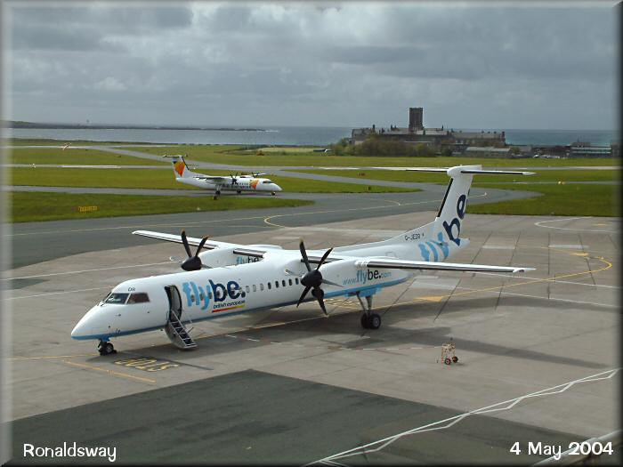 Almost new FlyBe Dash8 Q400, G-JEDR, parked on stand 4 as company Q300, G-JEDD taxies in, wearing the British European colour scheme.