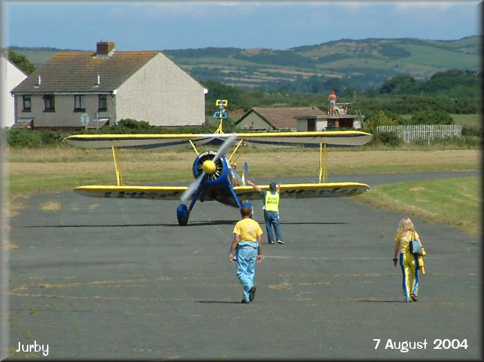 One of the 'Utterly Butterly' Boeing Stearman 'wingwalk' aircraft arrives.