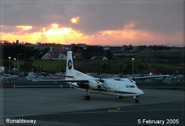 Denim Air Fokker 50, PH-DMS, parked on the west apron at sunset.