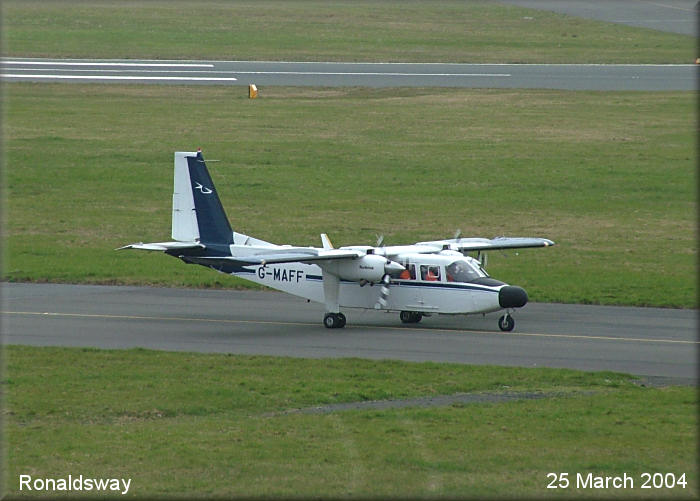 FR Aviation Turbine Islander, G-MAFF, taxies in after a Fisheries Protection flight over the Irish Sea.