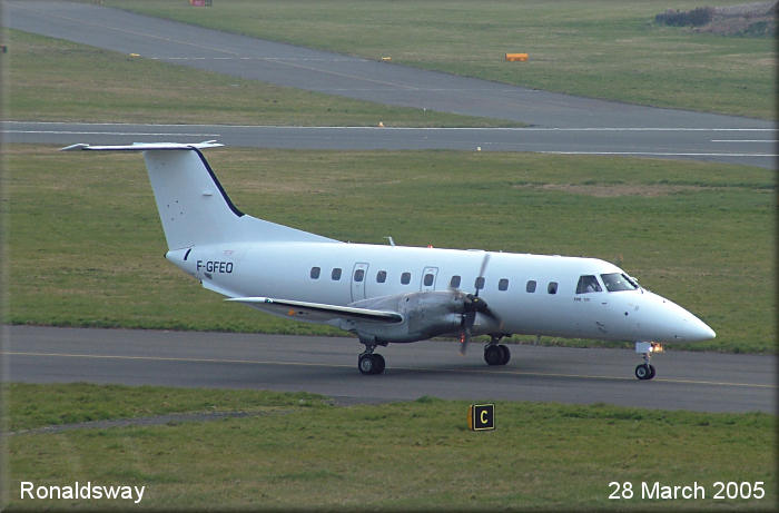 EMB120 Brasilia, F-GFEO, of Regional Airlines, taxies in after positioning from Paris Le Bourget. It will operate sevices for EuroManx. (But not for long!)