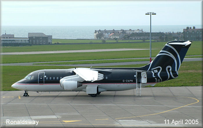 Titan AIrways BAe146-200, G-ZAPN, showing the cargo door fitted behind the wing on this passenger/freighter convertible aircraft.
