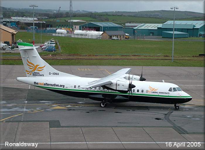 Air Atlantic ATR42, G-IONA, wearing temporary Liberal Democrats colours for the General Election 'across' in the UK.