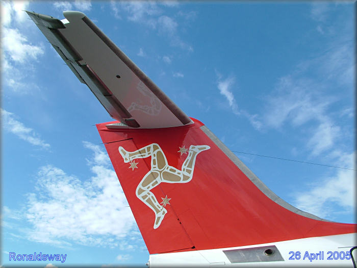 A close-up of the colourful tail of EuroManx RJ70, EI-CPK.