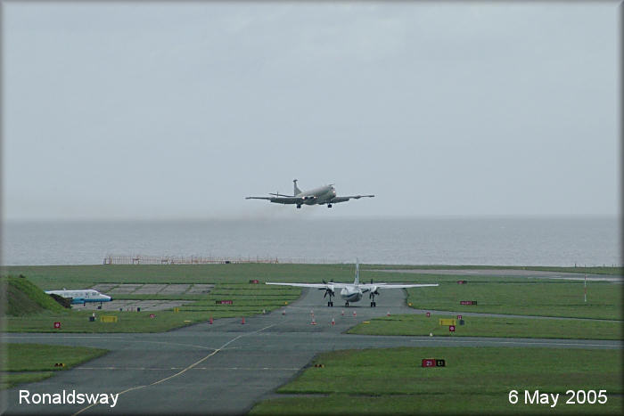 RAF Nimrod MR2 XV228 commences a low go-around on a practice diversion to Ronaldsway as a Denim Air Fokker 50 waits at the holding point.