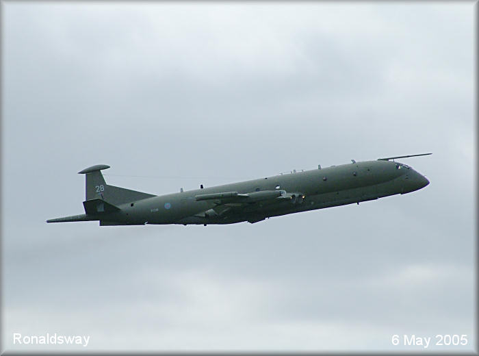 RAF Nimrod MR2 XV228, passes by the control tower before heading off on patrol over the Irish Sea.