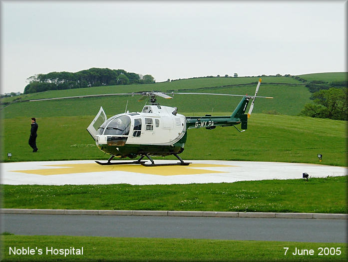 105, G-WYPA, on the helipad area at the new Noble's Hospital.This helicopter
