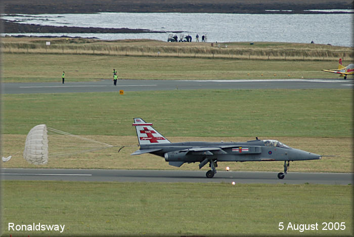 RAF 41 Sqn Jaguar GR3A, XZ103. streams its braking shute after landing - even the golf seems to have stopped to watch!