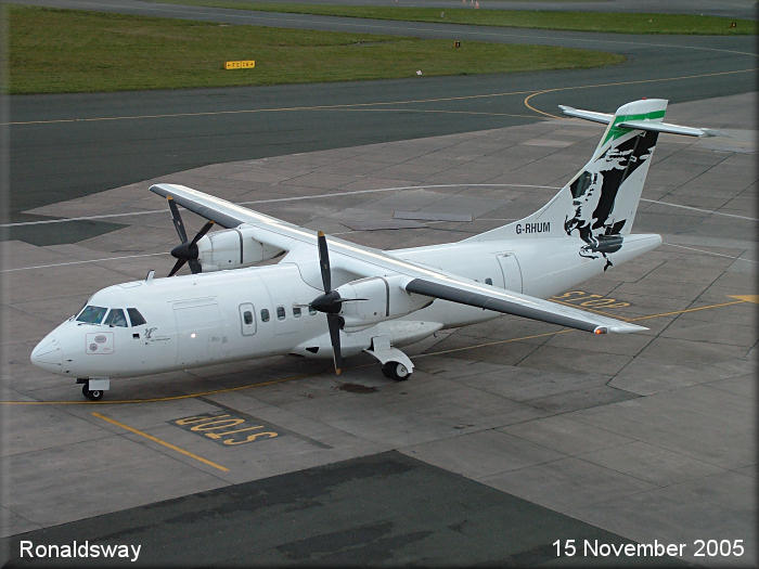 Air Atlantic ATR42, G-RHUM, painted all white for a long time, now sports an 'Air Atlantic' tail. Operating today for Aer Arran.