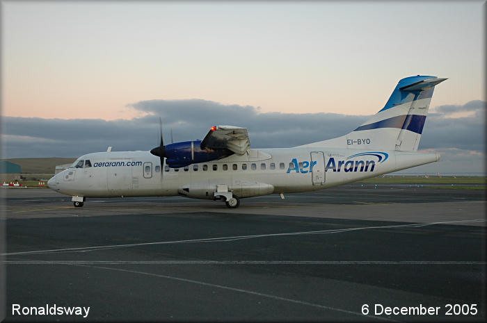 Aer Arann are now a major operator to the Isle of Man, with flights to Dublin, Manchester, Liverpool and London Luton. Here ATR42, EI-BYO, parks on stand 5.