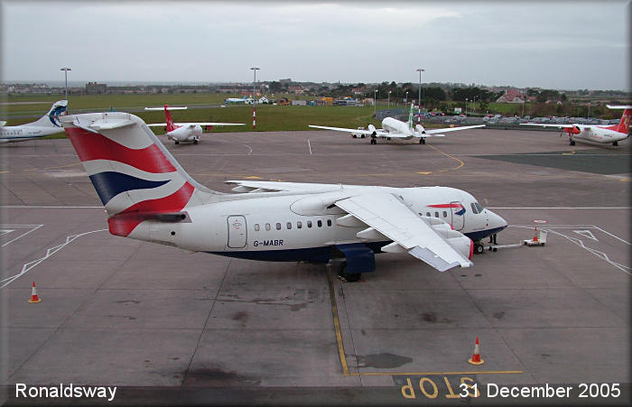 Mid afternoon on New Year's Eve at Ronaldsway and most of the aircraft have finished flying for the day, with BA CitiExpress BAe146-100, G-MABR, repositioned on stand three to be parked into wind..