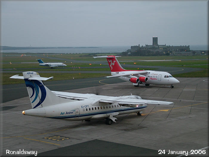Aer Arann ATR42, EI-CPT, waits to taxi from stand 4, as EuroManx RJ70 EI-CPJ arrives on the west apron.