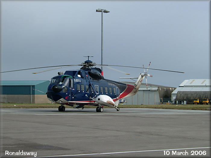 British International Helicopters S61N, G-BFFJ, during a brief refuelling stop en-route from Benbecula to Penzance.