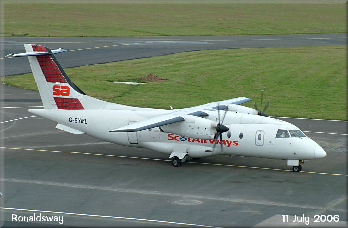 Scot Airways Dornier 328, G-BYNL, parks on the new stand 8, until recently the link taxiway between east and west aprons, after arriving on a charter from London City.