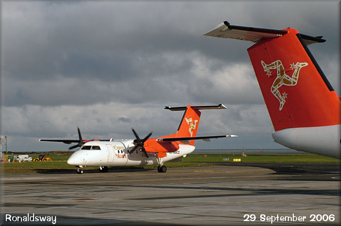 EuroManx Dash8 Q200, OE-HBB, taxies in past sister Q300, OE-HBC.