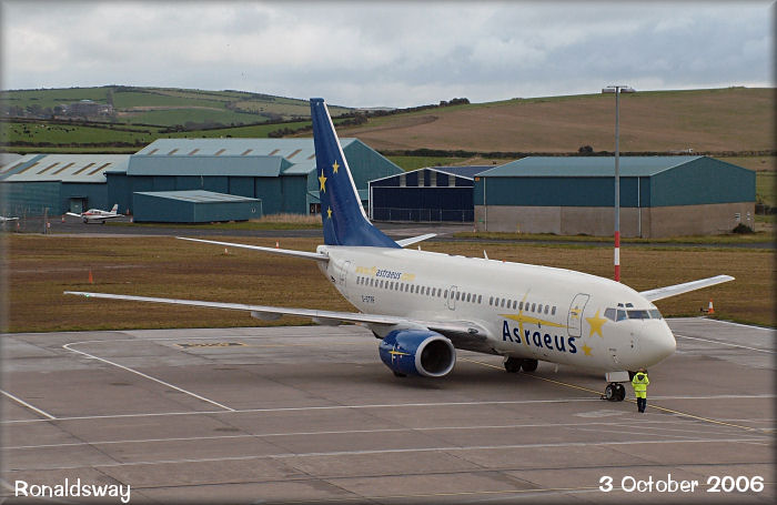 Astraeus Boeing 737-700 visited this morning, operating a charter flight to Ljubljana.