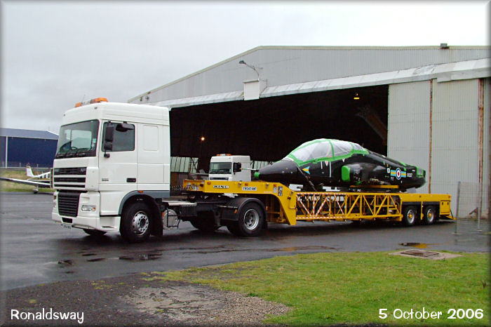 RAF Hawk T1, XX217, which diverted into Ronaldsway on the 4th September with serious engine problems, about to depart by road. The wing and fin are being loaded onto the lorry behind.