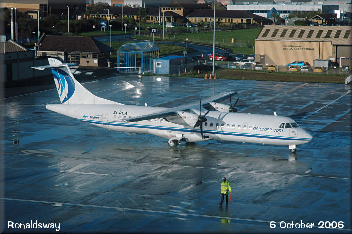With the sun shining after a heavy rainshower, Aer Arann ATR72, EI-REA, taxies for a flight to Luton.