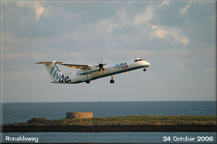 FlyBe Dash8 Q400, G-JECM, just airbourne and passing Fort Island.