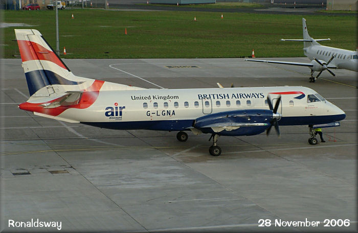 Loganair Saab 340, G-LGNA, about to taxi for departure, destination Glasgow.