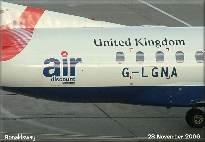A closeup of the new marking on Loganair Saab 340, G-LGNA. The text is 'air discount scheme for the highlands and islands.