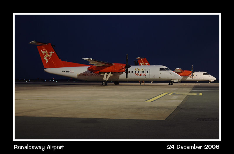 The two EuroManx Dash8s stand next to each other with Q300 OE-HBC nearest