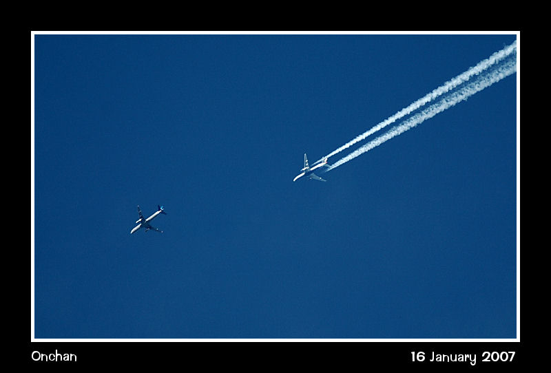 Not a 'near miss', the clue is that only one aircraft has vapour trails - different sized aircraft probably several thousand feet apart vertically